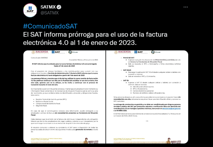 El Servicio de Administración Tributaria notificó el día de hoy (8 de junio del 2022) a través de sus cuentas de Twitter y Facebook que habrá una nueva prórroga para la obligatoriedad del CFDI 4.0, misma que será efectiva desde el 1 de enero del 2023; sin embargo, la institución hace hincapié en que las personas físicas y morales que ya adoptaron la nueva versión, sigan haciéndolo. Ver tweet original.